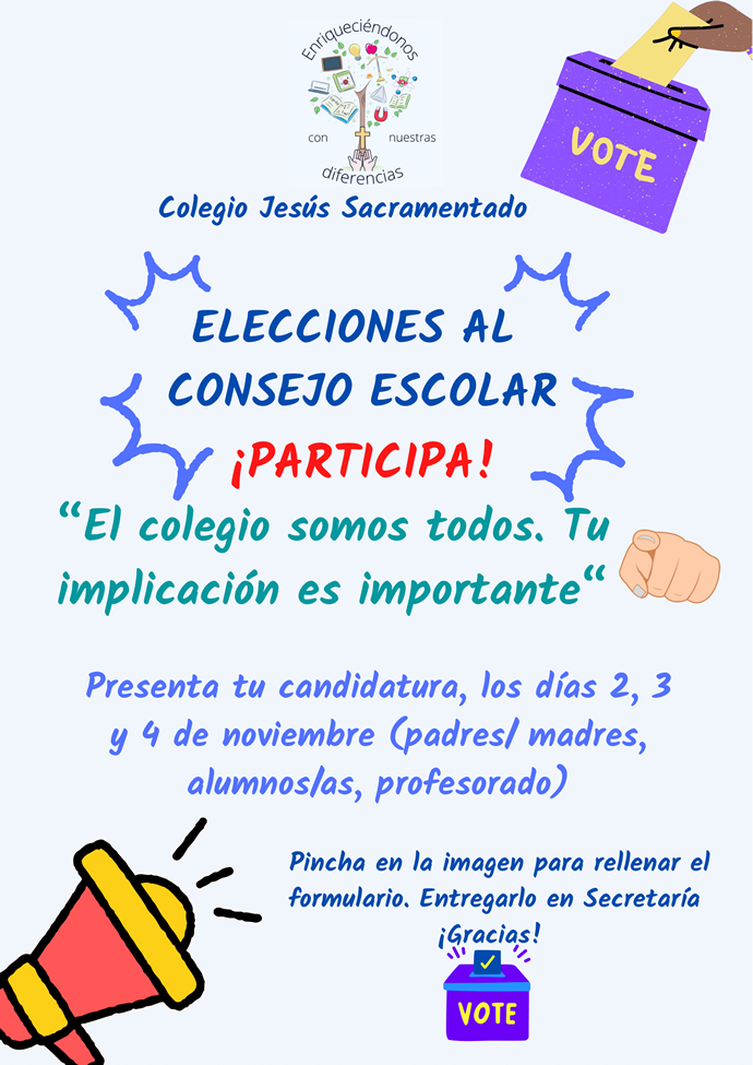 El miércoles, 23 de noviembre, tendrán lugar las votaciones para elegir a los representantes de padres/madres, alumnos y profesores. Los padres y madres podrán hacerlo en la biblioteca del colegio en horario de 13.00 a 17.30h. Allí estarán preparadas las papeletas para que marquen un único candidato. Es necesario que traigan su D.N.I. Como hemos venido diciendo, es importante tu presencia en esta decisión y es un proceso muy rápido y sencillo.